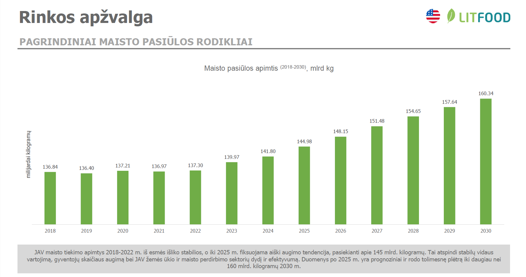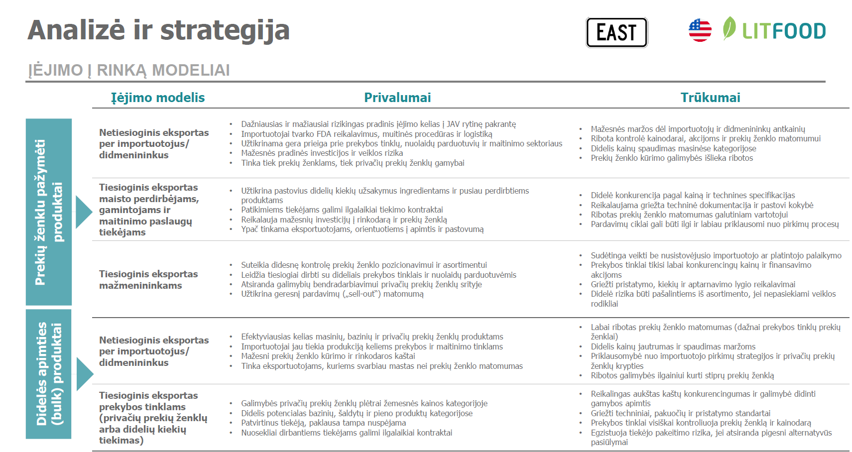 Tinkamiausią įėjimo į Jungtinių Amerikos Valstijų (JAV) rytų pakrantės rinką modelį Lietuvos maisto ir gėrimų eksportuotojams reikėtų pasirinkti atsižvelgiant į konkrečią verslo specifiką, produktų segmentą ir regioninę prekybos aplinką, kuri 2025 metais pasižymi dinamiška paklausa importuotoms maisto prekėms. JAV rytinė rinka yra viena didžiausių ir intensyviausiai vartojamų maisto produktų rinkų šalyje, todėl ji išlieka strategiškai svarbi Lietuvos eksporto kryptyje. Tačiau importo muitai, tarptautinės prekybos politika ir regioniniai suvartojimo modeliai gali turėti įtakos sąnaudoms bei konkurencingumui konkrečiose produktų kategorijose bei rinkos segmentuose.