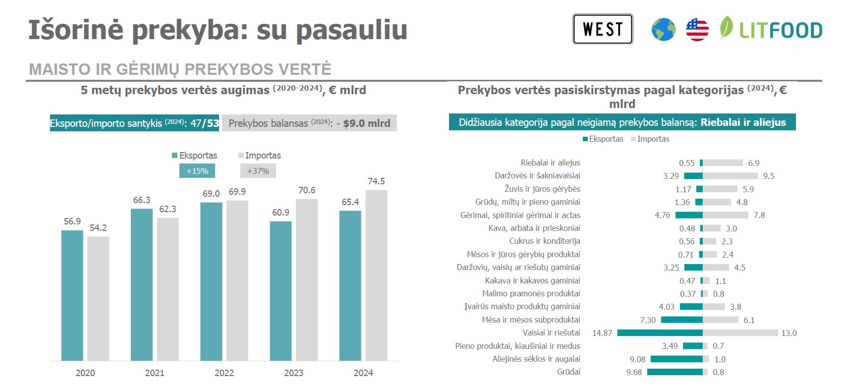JAV vakarų pakrantė daugiau importuoja maisto ir gėrimų, nei jų eksportuoja. 2024 m. regiono prekybos deficitas siekė apie 9,0 mlrd. JAV dolerių, o eksporto ir importo santykis sudarė 47/53. 2020–2024 m. importas augo gerokai sparčiau nei eksportas (+37 %, palyginti su +15 %), o tai rodo didėjančią vartojimo paklausą ir importo svarbą regiono prekybos struktūroje, o ne vietinės gamybos konkurencingumo mažėjimą.