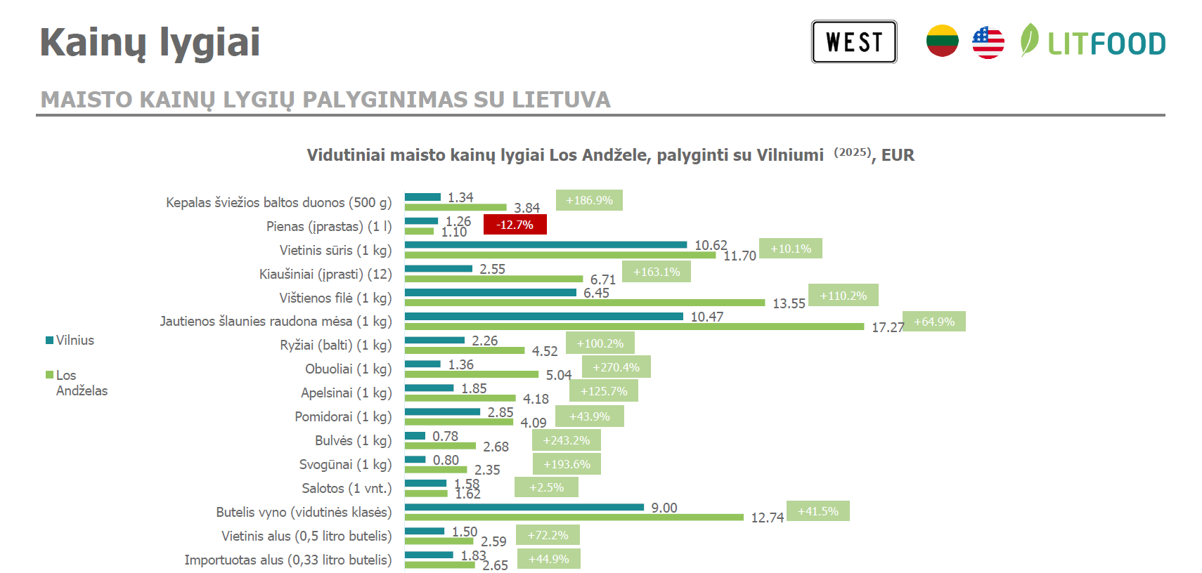 Vidutinės kasdienių maisto produktų kainos Los Andžele yra didesnės nei Vilniuje beveik visose pagrindinėse kategorijose. Didžiausi kainų skirtumai matomi obuolių, bulvių, svogūnų ir baltos duonos kainose – šie produktai Los Andžele kainuoja apie 187–270 % daugiau nei Vilniuje, o ryškiausias skirtumas fiksuojamas obuolių kategorijoje. Vienintelė iš nagrinėtų prekių, kuri Los Andžele yra pigesnė nei Vilniuje, yra pienas – jo kaina čia maždaug 13 % mažesnė.
