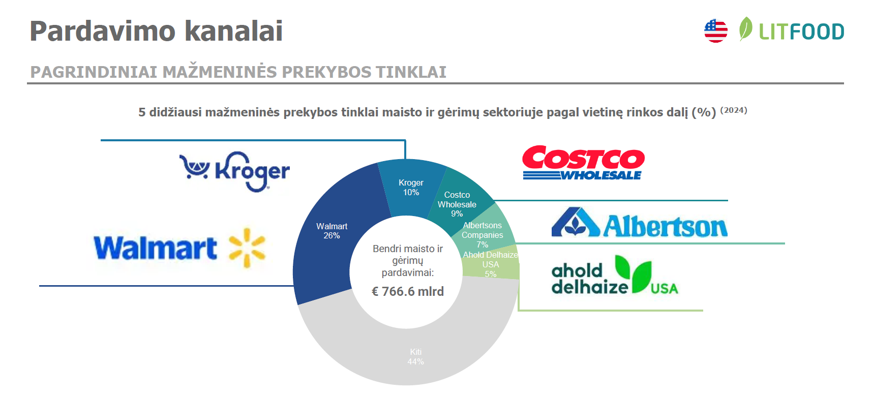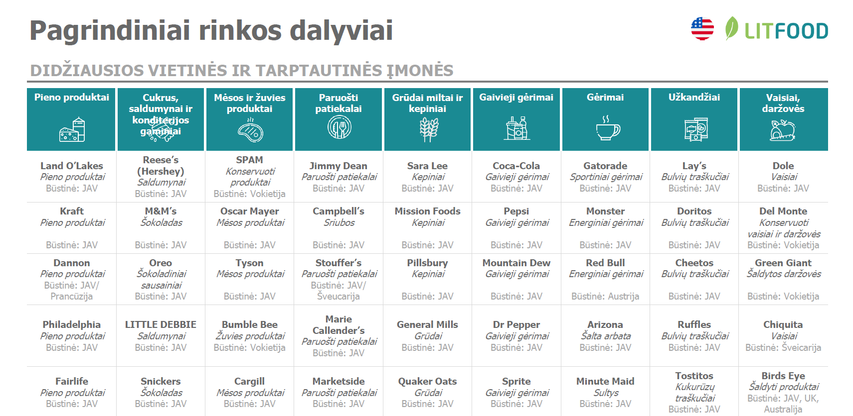 JAV maisto mažmeninės prekybos rinkoje nacionaliniu lygiu dominuoja keli dideli prekybos tinklai, kurie sudaro didžiąją dalį visų maisto prekių pardavimų. Šią koncentraciją lemia masto ekonomija, nacionaliniai platinimo tinklai ir stiprios privačių prekių ženklų strategijos, kurios didiesiems prekybininkams suteikia didelę derybinę galią ir įtaką kainodarai bei asortimento sprendimams.